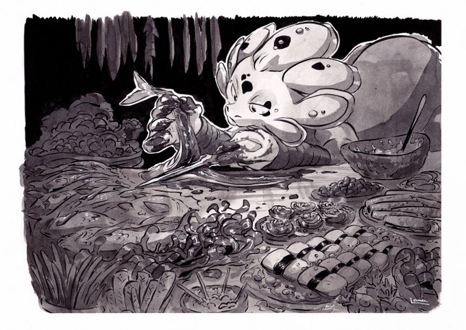 🇬🇧 Salamanders' food is quite diverse : seaweed, fish, fruits or vegetables, etc... 🇫🇷L'alimentation des Salamandres est assez variée : algues, poisson, fruits ou légumes, etc... #inktober2022 #art #comics #ink #fantasy #furry #furryartist #sketchaday #salamanders #Food
