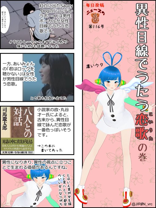 おはようございます! #ニュースの壷 「異性目線でうたう恋歌」 日本には、宝塚、歌舞伎、バーチャル美少女等、「異性装」という文化があり、今回のテーマと関連してるかもしれません。 ご興味があれば↓ twitter.com/JIR0N_vrc/stat… #漫画が読めるハッシュタグ #SaucyDog #あいみょん