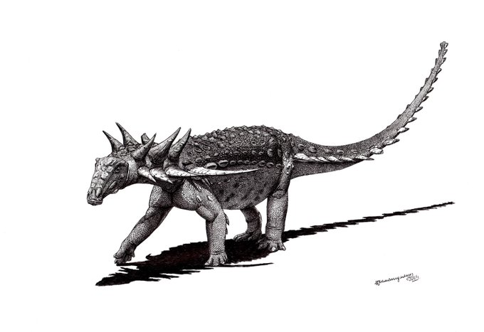 I drew my first ankylosaur! It's Sauropelta edwardsorum, a nodosaurid from early Cretaceous of Cloverly Formation. This animal is one of well known taxa in its family. It have two rows of big neck spikes and unusually long tail. #paleoart #sauropelta