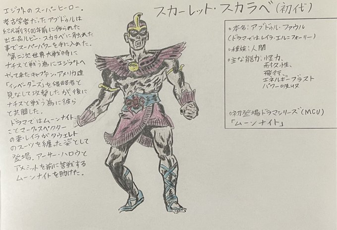 手描きMCUヒーロー列伝スカーレット・スカラベ ・本名:アブドゥル・ファウル (レイラ・エル=フォーリー) ・種族:人間 ・能力:怪力、飛行 ・初登場ドラマ作品(MCU) 『ムーンナイト』 #marvel #illust #芸術同盟 #絵描きさんと繋がりたい #みんなで楽しむTwitter展覧会 #MsMarvel #scarletscarab