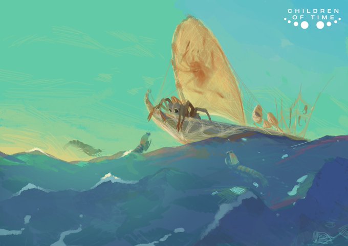 Sailing spiders from the time of early understandings, crossing a strait in Planet green and coming into contact with curious stomatopods. from @aptshadow 's #ChildrenofTime series #illustration #scifi #fanart