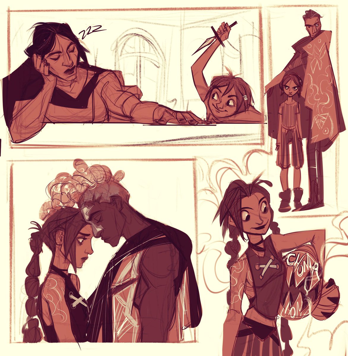 Some #arcanefanart sketches. Powder/Jinx playing “knife fingies” with sleepy Sev 😅 #silcofanart #jinxfanart #ekkojinx #Sevika