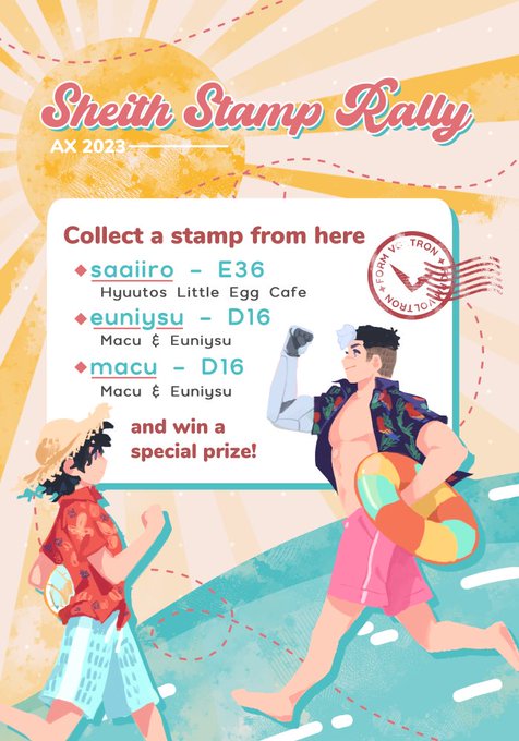 Mini #sheith stamp rally at #AnimeExpo2023 hosted by @saaiiro @Macu_artz and myself #AXartistalley2023 Come to either D16 or E36 to pick up a rally card and get stamps from both tables Once you collect all 3 stamps we'll give you a sticker! (depending on which table you end at)