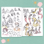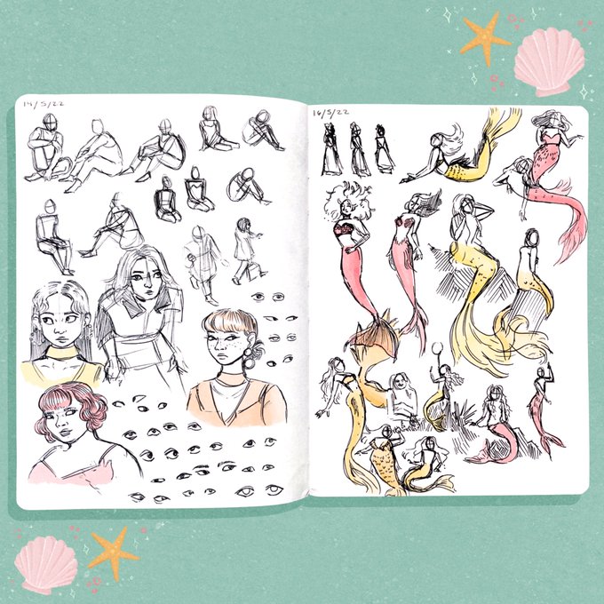 Sketchbook spread, bunch of pose studies including lots of mermaids! Added some colour in post cos it’s fun to play around with the sketches digitally #illustration #digitalart #art #sketchbook #sketch #mermay #mermaid #shells