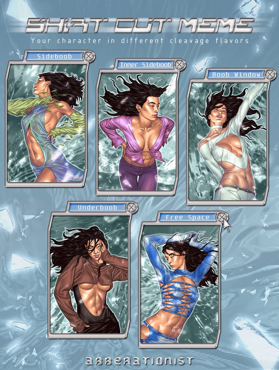 Time for an update of my fave social media art challenge, SHIRT CUT MEME!!✂️🪡 (see thread for full images) #shirtcutmeme #artchallenge #rogue #roguexmen #baroness #thebaroness #gijoe #makima #chainsawman #zatanna #bayonetta #yorforger #spyxfamily #pinupart #whatthefanart