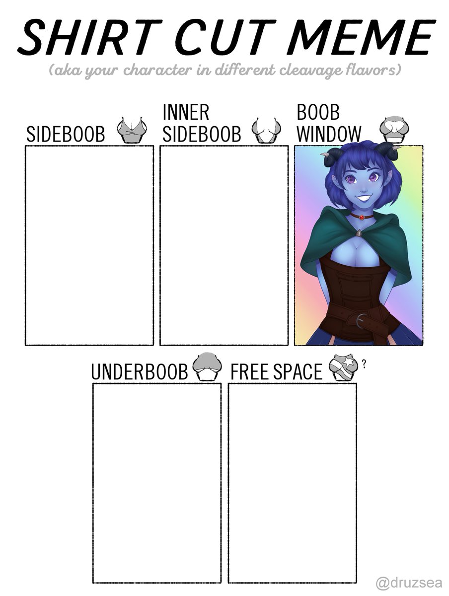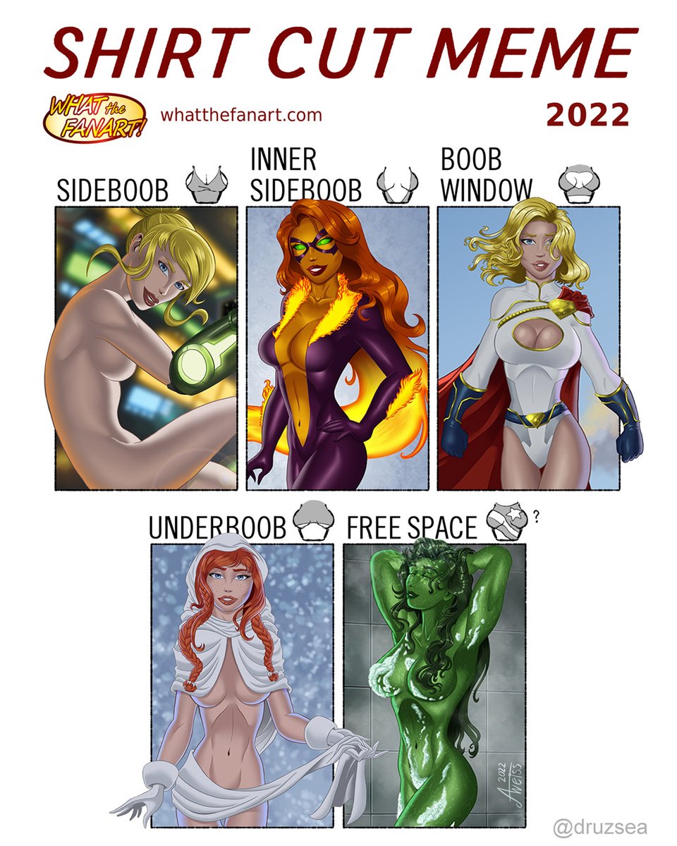 All the new art I've made in the last year, time for an update of social media's most fashionable meme, SHIRT CUT!✂️ (see thread for full images) #shirtcutmeme #druzsea #artchallenge #pinupart #fanart #whatthefanart