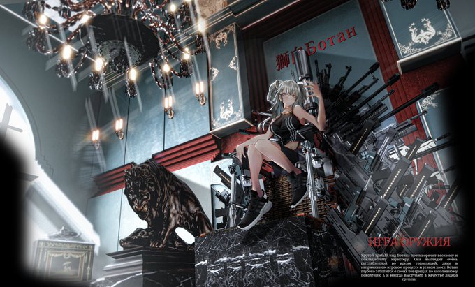 Shishiro Botan Comissioned by Rubah on twitter, requested the Iron Throne to be made of guns and weapons, references to the russian tsar and the soviet architecture at a glance, with brass chandelier setup the mood #ししらーと #shishirobotan