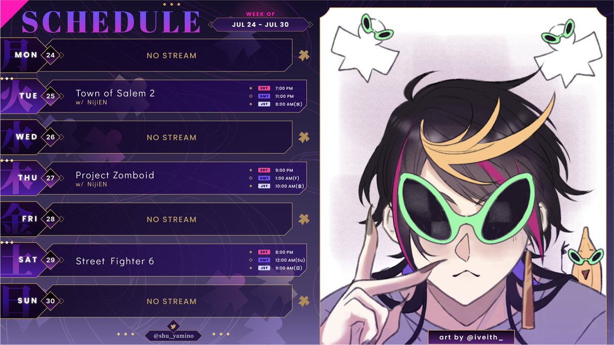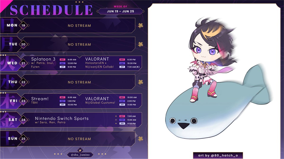 👟Schedule☯️ tentative sched! Hashtags 👟 General - #ShuYamino Live Tag - #Yaminow Art - #YaminoArt Memes - #ShuNanigans Clips - #ShuClip #ShuClipEN #ShuClipJP Thumbnails: #Shumbnail