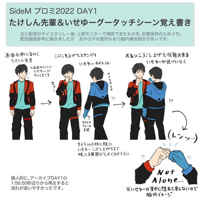 プロミDAY1での たけしん先輩&いせゆーのグータッチ箇所が凄く良かったので、円盤に収録されない可能性を考えて記憶保管用に覚え書きメモ! 配信見ながら脳内補完含めて 雰囲気の記録しときました。 #SideM #SideMプロミ2022_day1 #idolmaster
