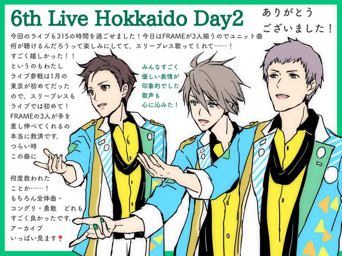 本日もお疲れ様でした!ありがとうございました!本当に良かった。゚(゚´ω`゚)゚。スリーブレス大好きなので歌ってくれてすごく嬉しかったです。FRAMEは救済。FRAMEのおかげで毎日元気に生きてる。転んでもこの手を取れば大丈夫って思える。呼吸の仕方を教えてくれるFRAME😭 #SideM6th_北海道day2