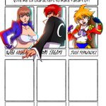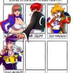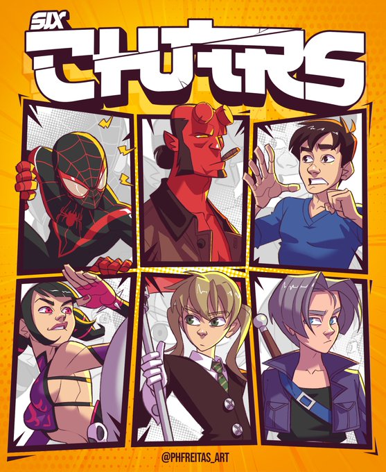 Fiz um layout diferente porque vou fazer um todo mês agora, achei daora. #sixfanartchallenge Miles Morales, Hellboy, Jackie Chan (Adventures), Juri, Maka, Trunks.