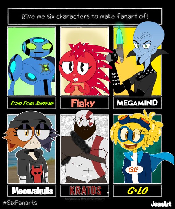 Thank you very much to those who commented on your character, I hope you have been selected for this challenge #SixFanarts #Ben10 #ben10fanart #happytreefriends #Megamind #Dreamworks #Fortnite #meowskulls #Kratos #GodofWarRagnarok #sixfanartchallenge #Villanos #Villanus #Flaky