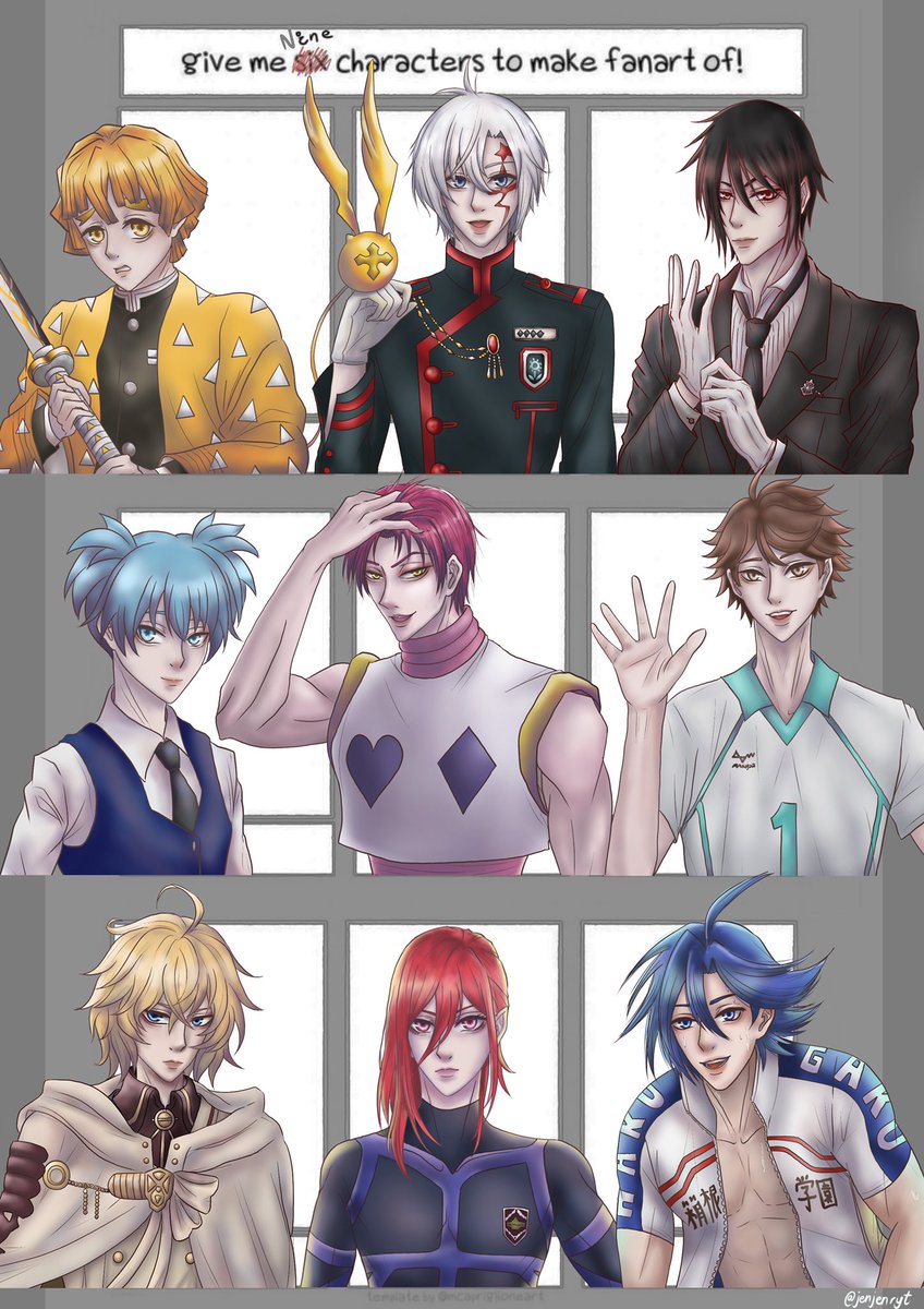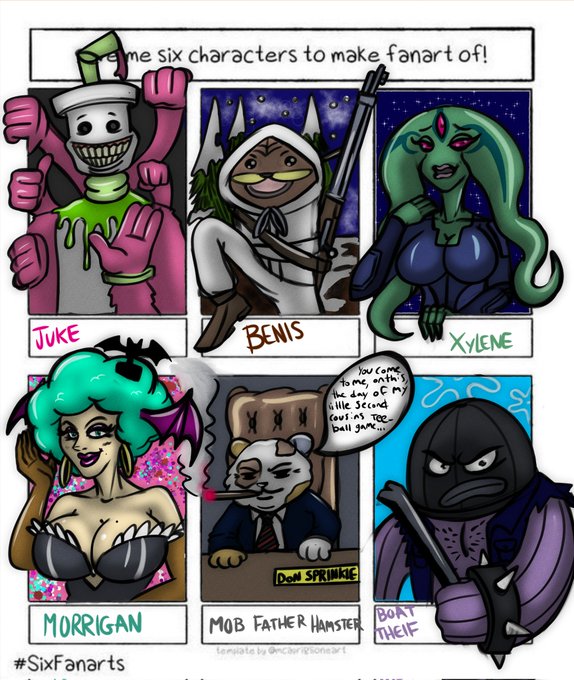 Six characters drawn by @Onionsentai Characters suggested by: Juke @Skidand97820393 B E N I S @AngelicKnight97 Xylene @Uxorite Morrigan @yesplz48280758 Mob Father Hamster @hampsterofx Boat Thief @EthanCu45620602 #artistsoftwitter #SixFanarts #sixfanartchallenge
