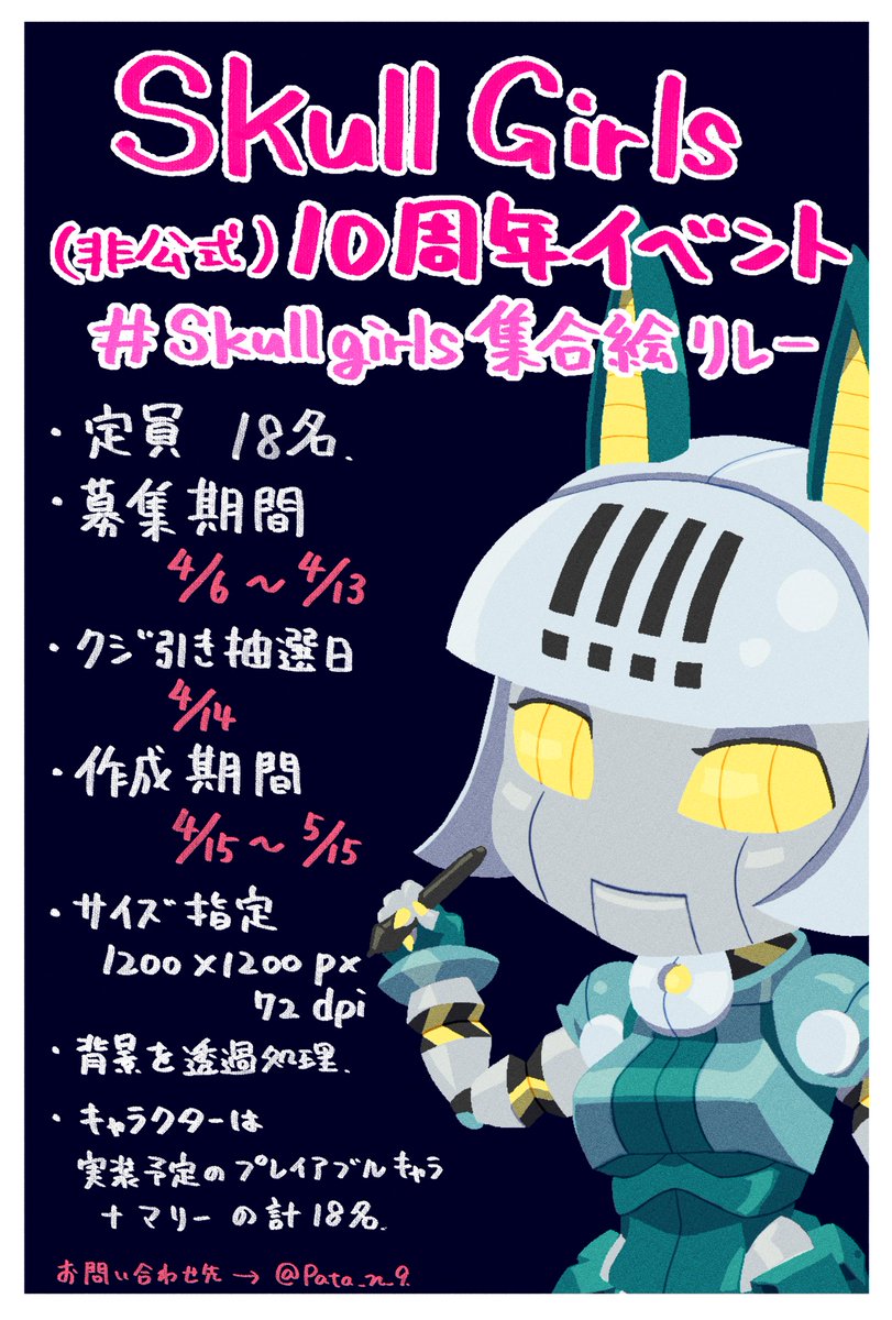 イベント開催のお知らせです!!! SkullGirls10周年の記念に、みんなで集合絵を描きませんか? 期間は一ヵ月、1人1キャラで、担当はクジで決定します。 提出された絵を私が集合絵に仕上げます。 参加希望者はこのツイートにリプライを下さい。 どなたもお気軽に🤗 #Skullgirls集合絵リレー