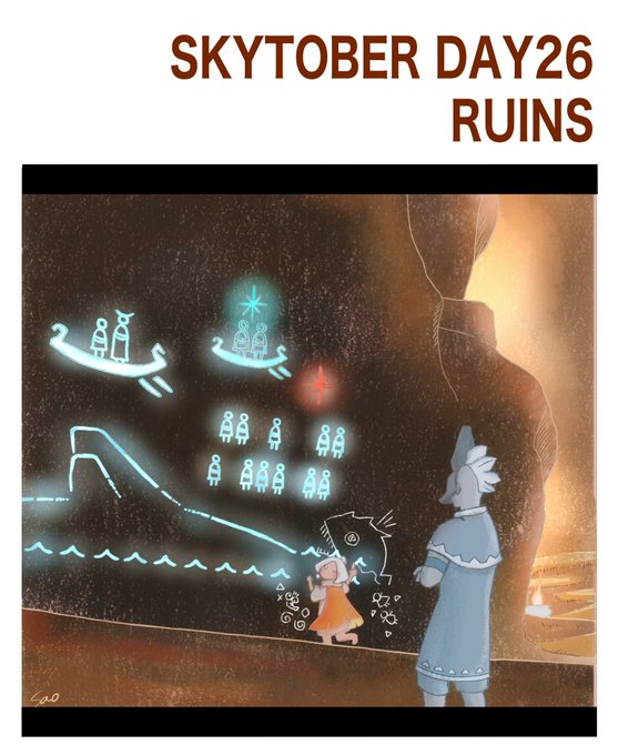 【⚠️描き終えるまでが10月です!】 雀『なんだか凄い沢山絵が描かれてるなぁ!! へへへ、私もちょっと付け足しちゃお!!』 アヌ様「……(`‐ω‐´)」 雀『( ゚∀ ゚)ハッ!』 な瞬間w (背景の壁画はトレス) #sky星を紡ぐ子どもたち #skyイラスト #Skytober2022