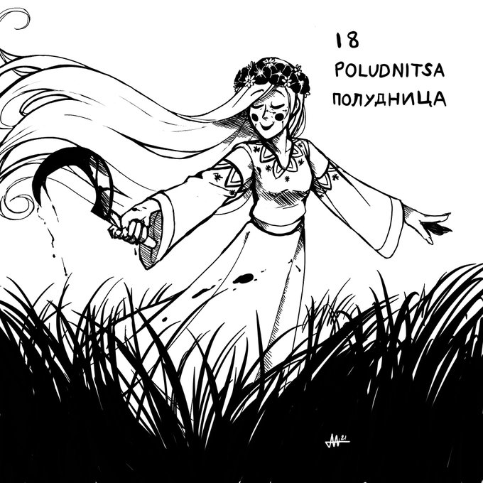 “Slavtober” Day 18- Poludnitsa Lady Midday, aka the Noon Wraith Another Slavic mythological figure I’m unfamiliar with. #dailyart #dailysketch #inktober #inktober2021 #fantasyart #fantasyartwork #slavicmythology #slavic #horrorart #wraith #illustration #sickle