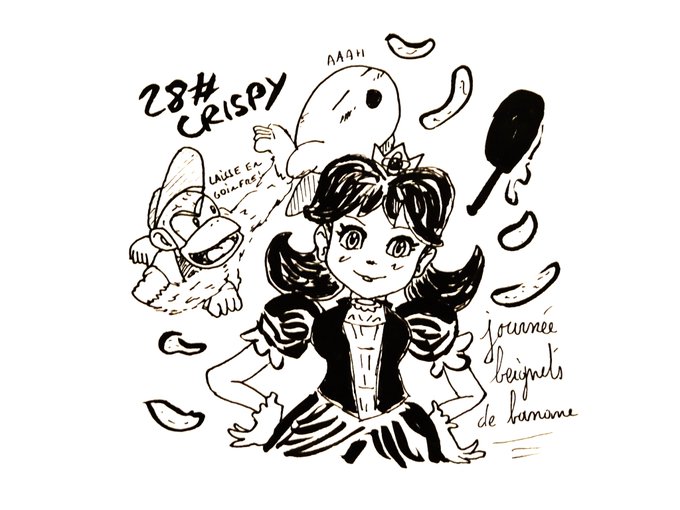 Day 28 - Crispy : La frying pan de Daisy en action pour le bonheur de Kirby et Diddy. #inktober #kirby #SmashBrosSP #inktober2021