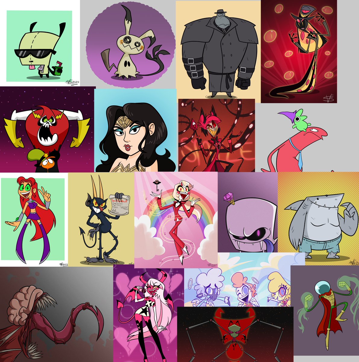 List of all the art (so far) I would love to make prints, stickers and keychains to sell at a con one day ^^ Some I do plan on fixing or remaking entirely. #art #drawing #digitalart #dc #HazbinHotel #smilingfriends #ResidentEvil #HelluvaBoss #nintendo