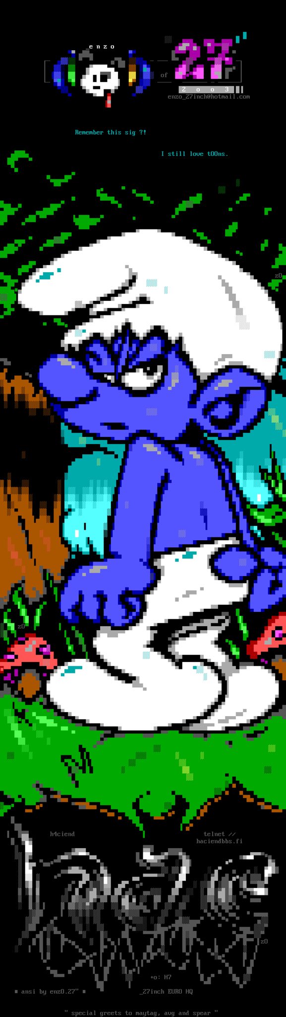 THIS DAY IN #HISTORY — 1958 - The #Smurfs first appear in the story "Johan and Pirlouit" by Belgian cartoonist #Peyo ANSI by enz0 / 27inch (2003) #ansiart #ansi #ascii #asciiart #pixelart #textmode #text #art #demoscene #bbs #retrocomputing #retrographics #graffiti #graffitiart