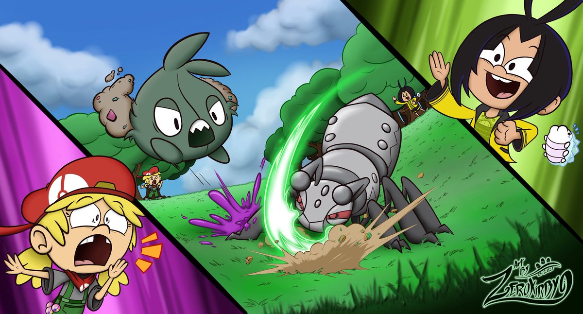 [2021-10-21 / Tier IV] An amazing commission for @Creshosk Lana and Aaron (OC) having a Pokémon battle!! That little Trubbish is in trouble as Durant is a force to be reckoned with! #Commission #TheLoudHouse #Fanart #Pokemon #originalcharacter #Durant #Trubbish #LanaLoud #Snom