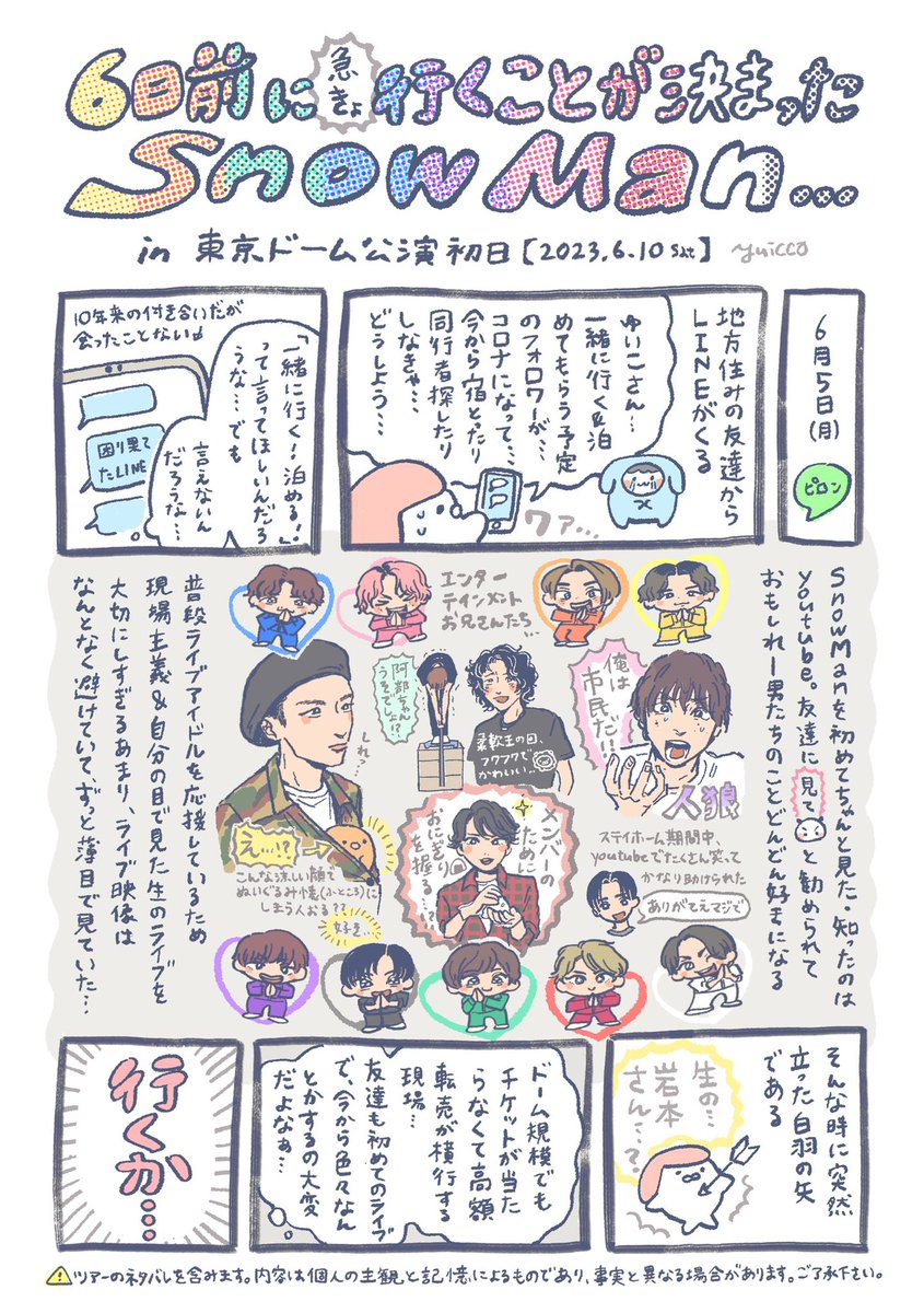 6日前に急遽行くことが決まったSnowMan in 東京ドーム公演初日【2023.6.10】1/3 アイドルオタクが初めて生の⛄️を見るまでの日記兼・レポ漫画を描きました❤️🔥 すごかったです。SnowMan、ありがとう…。 #SnowMan1stDOMEtour2023iDOME