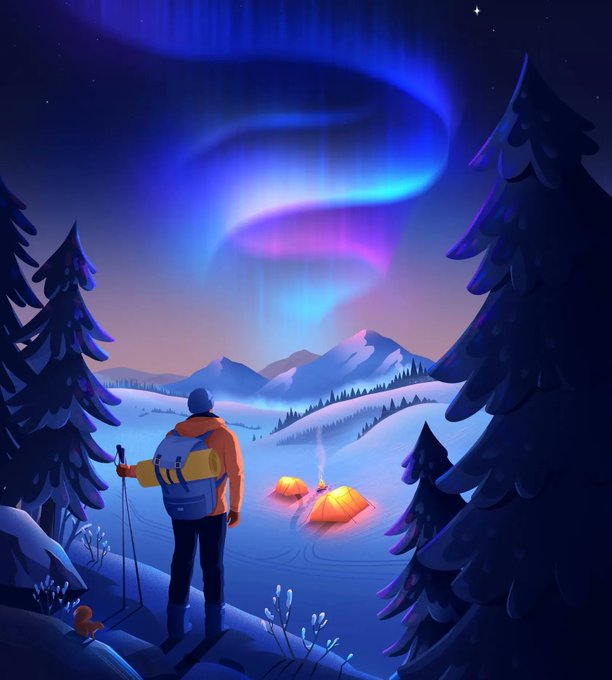 An awe-inspiring illustration for “Discover Sweden” by #AnnaKuptsova, represented by the @BrightIllo. Explore more work by Anna: buff.ly/3FyYI7R #illustrationinspiration #discoversweden #inspiringart #nature #illustration #sweden #northernlights #aurora #snowylandscape