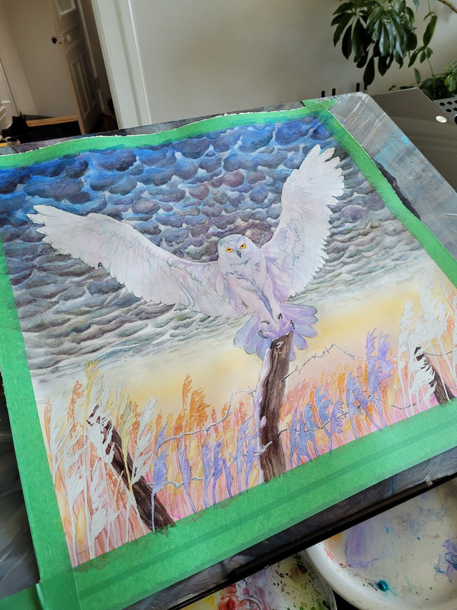 Rate 1-10, how's this painting going? #owls #snowyowl #watercolor #painting #artwork #artstudio #animalart #birdwatching #naturesketch pic.twitter.com/aeF01ywGJ0