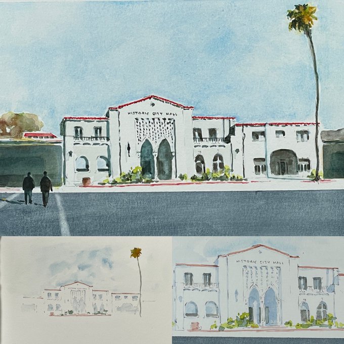 Evolution - Old City Hall, San Clemente daviddpearce.com #ddpearcefineart #urbansketchers #SoCal #architecture #watercolorpainting #landmarks #elcaminoreal #avenidadelmar #artoftheday #contemporaryart #originalwork @CitySanClemente @SCTimesNews @SCChamber1