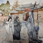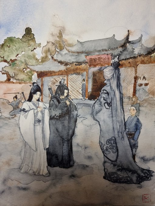 Day 3 of the #frostandsnow2022 event. Prompt "family". SL visiting Baixue with his new friend XXC and introducing him to his family: shifu and brothers. That said, off to bed I go. #SongLan #songlanfanart #mdzsfanart #Watercolour #songzichen