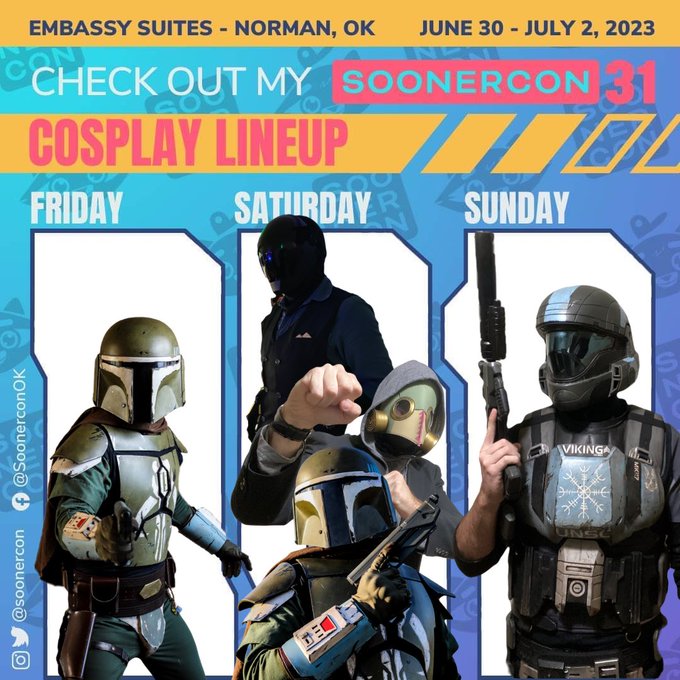 My @Soonercon lineup. Saturday Mando is kind of a backup and depends on how I’m feeling #cosplay #soonercon