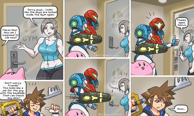 Oh no. Wii fit trainer can't unlock the gym. Maybe Sora could help with that keyblade? Wait what's Samus doing there? 🗝🛸🏃♀️ #SmashBros #SmashBrosUltimate #SuperSmashBros #SmashUltimate #Nintendo #NintendoSwitch #metroid #MetroidDread #kingdomhearts #sora #Sora4Smash