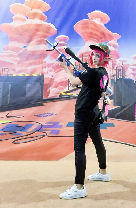 フォトスポットで遊んできた 武器を持てて最高! 今回だけなんて勿体ないから 今後もどこかで展示してて欲しい 🔫(^ω^ )バキュン 二枚目 耳つけるの忘れてました🙇💦 #ニコニコ超会議コスプレ #Splatoon甲子園