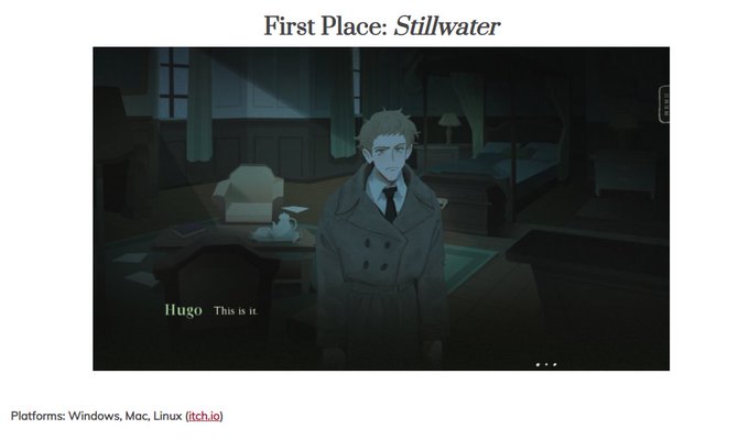 Stillwater won 1st place for #SpooktoberVNJam!! 😭🏆❤️ i still can't believe it! thank you everyone for the love and support we received for our little game!!! 👻 play Stillwater here: studioclump.itch.io/stillwater