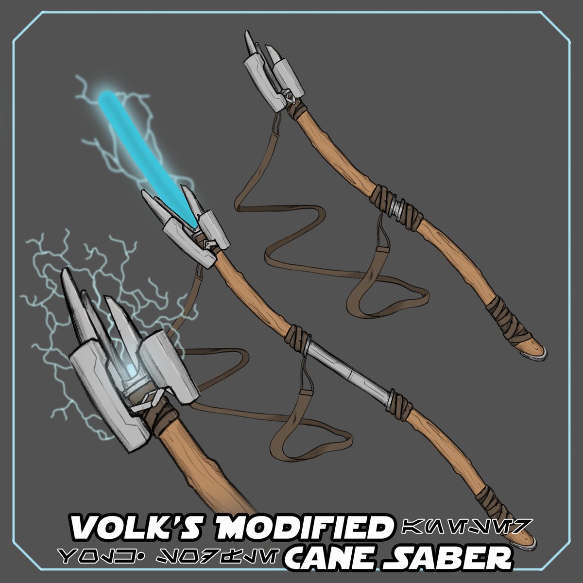 Modified Lightsaber Lance - Created out of a reclaimed branch from his homeworld, Artificer-in-training Volk, equipped his new saber with and extended reach and an unstable great-blade that doubles as an Ion Blaster. #design #dnd #dndart #StarWarsRP #characterdesign