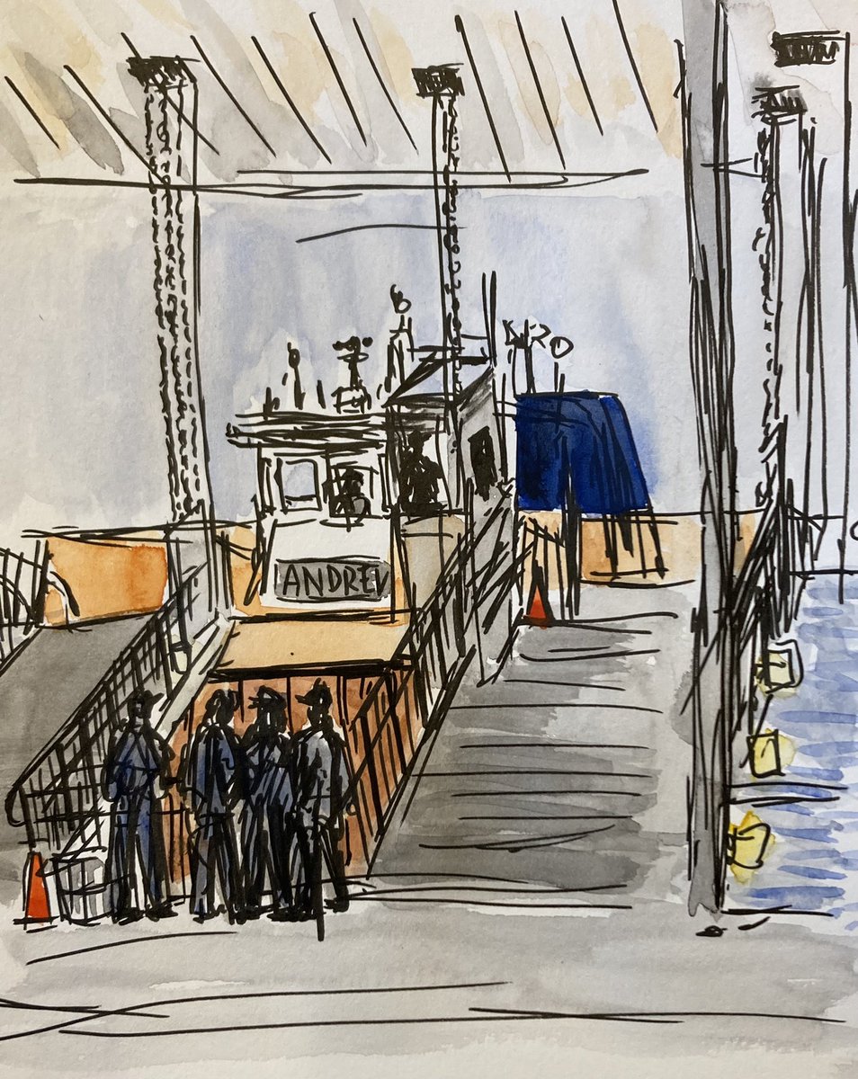 Waiting to board the 7:15am SSG Michael Ollis Staten Island ferry this morning. #art #ink #watercolor #ferry #StatenIslandferry #StatenIsland