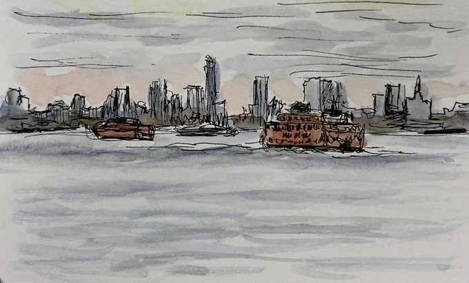 Wednesday at sunset on the Staten Island ferry. #art #ink #watercolor #StatenIsland #ferry #statenislandferry #nyharbor