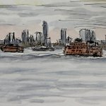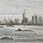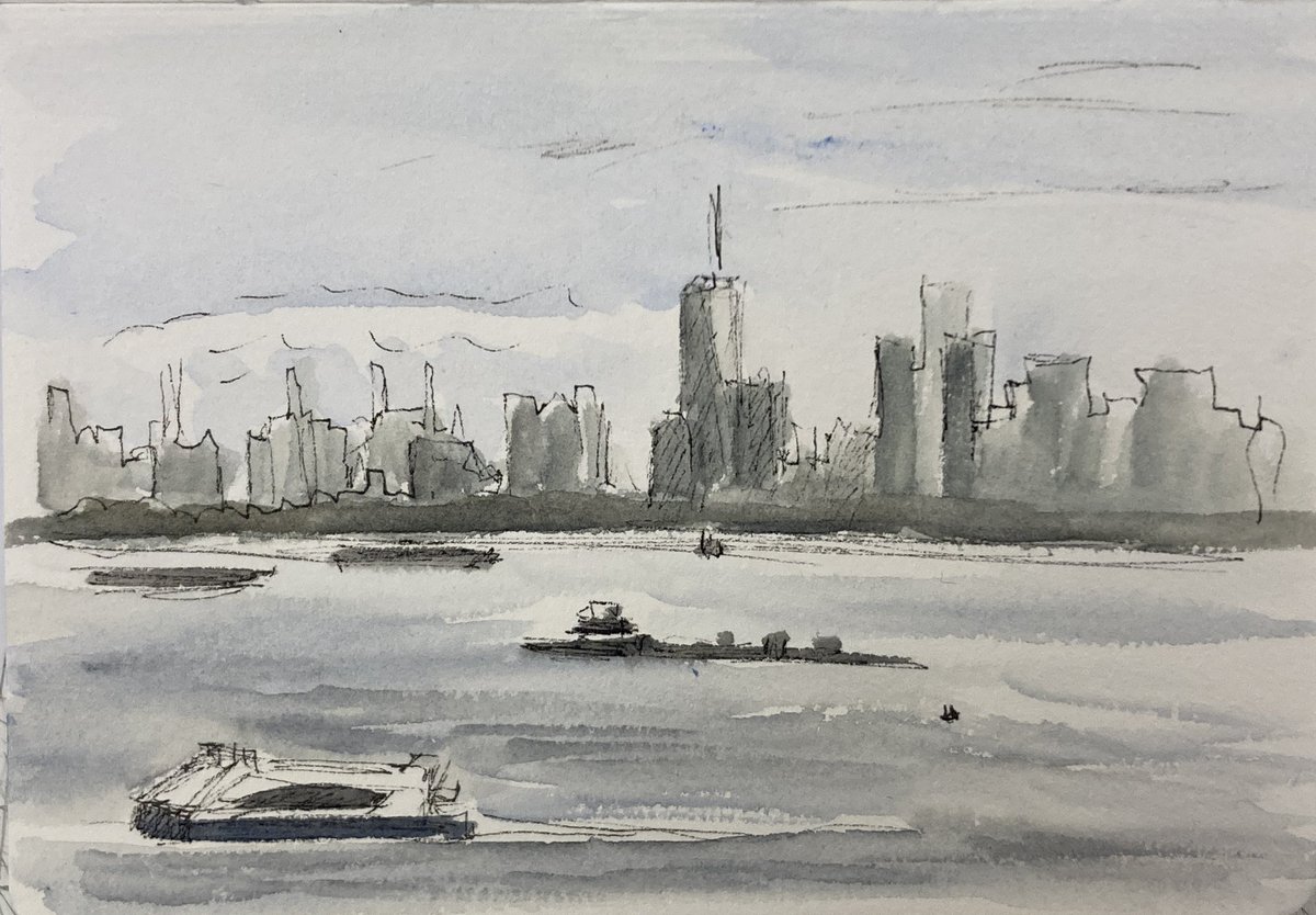View of NY Harbor from the Staten Island Ferry—headed to Manhattan. #art #ink #watercolor #nyharbor #StatenIsland #statenislandferry #ferry
