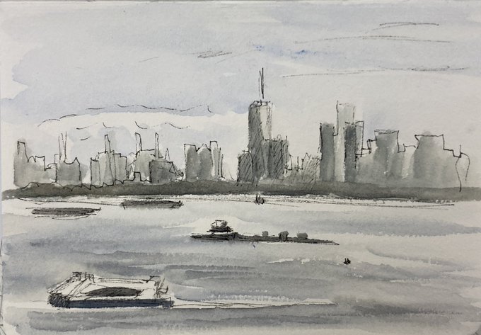 Tuesday morning on the 7:30am Staten Island ferry. Brooklyn is in the distance. #art #ink #watercolor #nyharbor #statenisland #statenislandferry