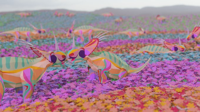 ok I finally made something with model from my avatar Herd of Styracosaurus spending time in the field of flowers! #paleoart #lowpoly #styracosaurus #dinosaurs