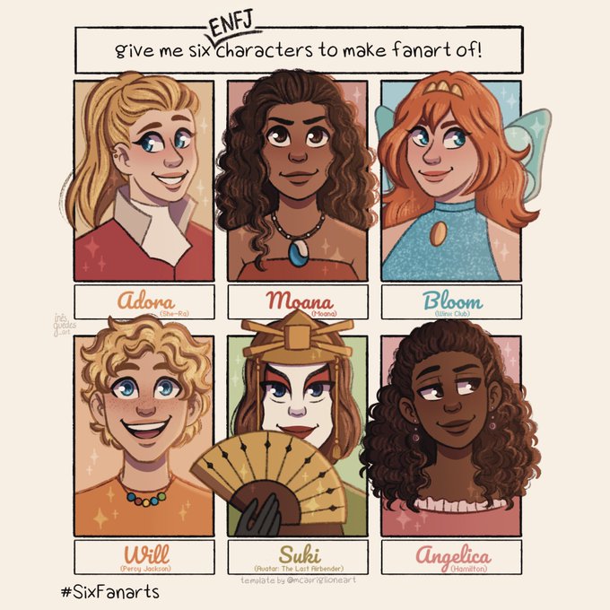 Thought it'd be fun to do the 6 fanart thing but with characters that share my MBTI! ⚔️💚 What's your MBTI? ✨ #sixfanarts #sixfanartschallenge #mbti #enfj #adora #moana #bloom #willsolace #suki #angelicaschuyler