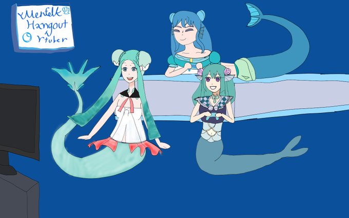 Day 21 and 22: Peace and Virtual World. Merfolk vtubers hangout where everyone can rest and play together in peace and lay their tails! From Left to Right: Sumi Ushio(Graduated), Mera Mizu, and Finana Ryugu! #SumiDoArt #meramizart #Finanart #mermay2022
