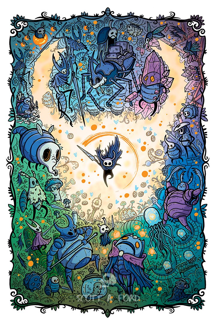 In honour of #Silksong's new trailer here's my #hollowknight illustration! 🪲🗡️🐝🪡🧵🦗🐛🕷️ Currently replaying it. I love this game so much and I can't wait for the sequel! scottafordart.com #teamcherry #illustration #e3 #SummerGameFest #videogames #SummerGames