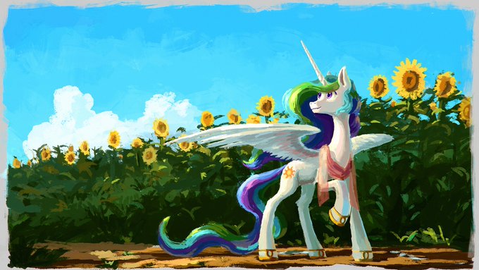 It's a beautiful summer solstice~ Care to join Celestia among the sunflowers? Artwork is by plainoasis! deviantart.com/plainoasis/art… #mlp #fanart #SummerSolstice2022