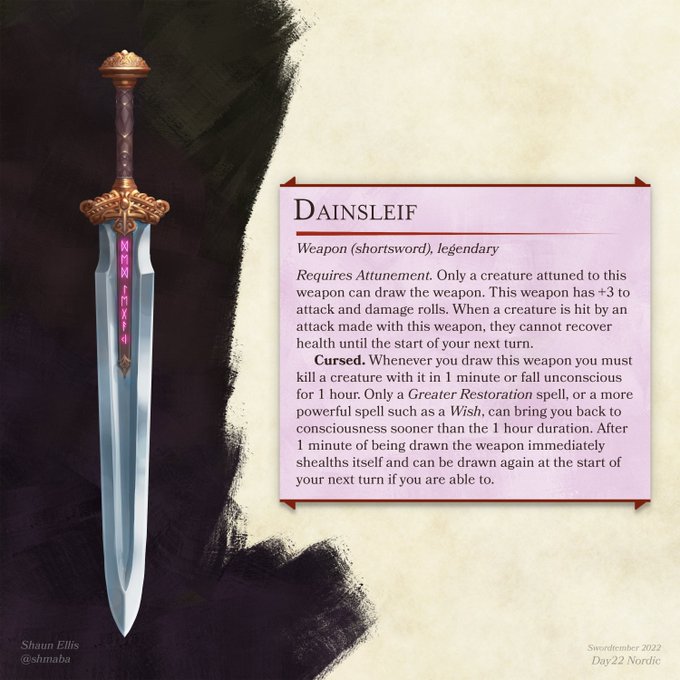 Day 22 - Nordic Alright I really didn't know what to do for this one so here's my own version of the weapon Norse myth Dainsleif. Legend said it *must* kill someone when drawn, so be sure to get that killing in quick #swordtember #swordtember2022 #dnd #dungeonsanddragons