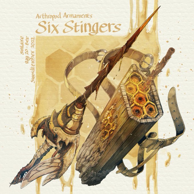 #swordtember #swordtember2022 Day 20 - Bee Arthropod Armaments Six Stingers I guess this kinda matches with the previous flower theme sword XD Hi-Res images and Stats are available on my Patreon