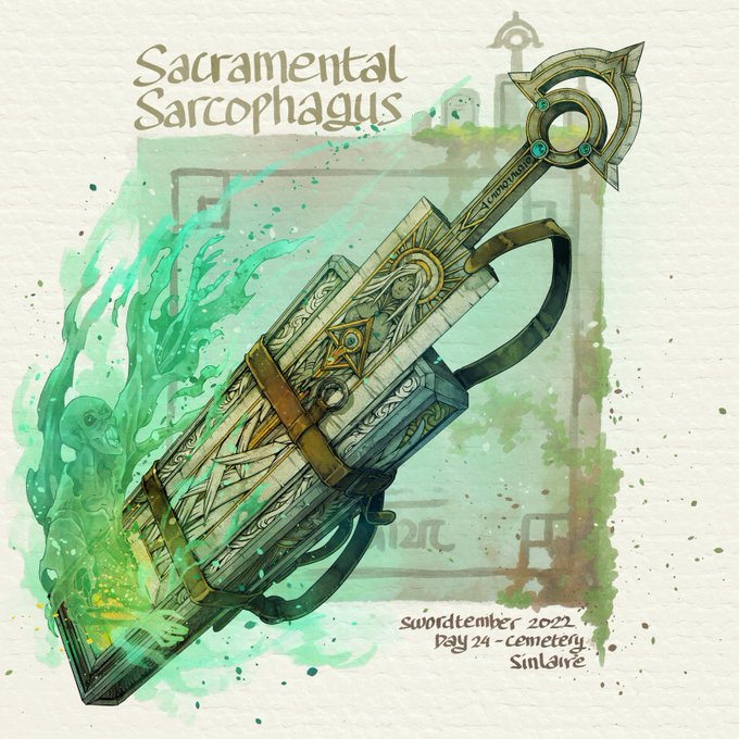 #swordtember #swordtember2022 Day 24 - Cemetery Sacramental Sarcophagus An item wielded by the Gravekeeper of The Serene Soil that grand its wielder the ability to purify corrupted and lost souls. Hi-Res images and Stats are available on my Patreon