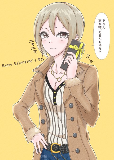 塩見周子、バレンタインデーは仕事終わりに完璧な状態のチョコを渡すイメージ。あえて仕事終わりまでチョコの話題に触れない。仕事中にチョコの事でヤキモキするPも見られるし、仕事初めにチョコを渡して扱いに困る事態も防ぐ立ち回り。 #塩見周子 #一週一周子 #SyukoShiomi #バレンタインイラスト