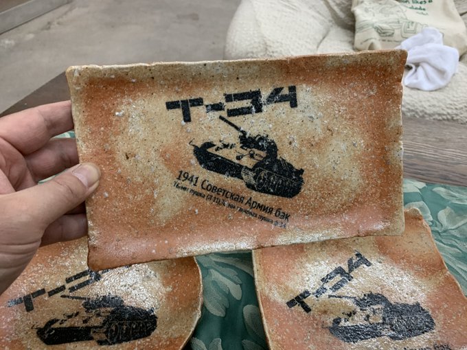 ワンフェスに持って行く"T-34陶皿"が窯から出て来ました。炎、砂塵の中を進軍しているイメージを信楽焼の緋色が上手い事出したじゃないか。 ディラー名【DT窯】卓番号【6-13-15】 【大器の器ブログ】 bit.ly/314dOPg #wf2020w #DT窯 #信楽焼 #信楽 #ワンフェス2020W #ワンフェス #T34