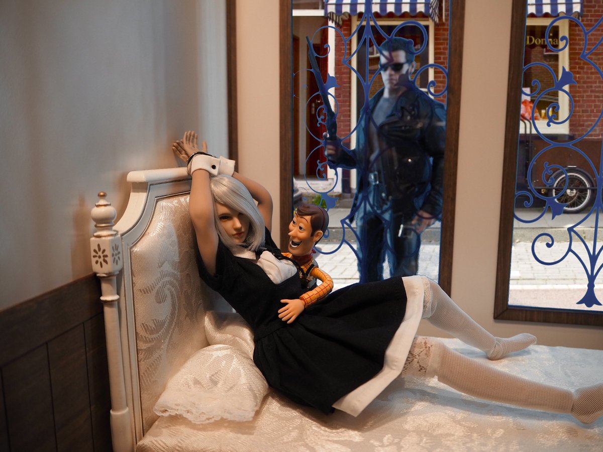銀髪メイドお姉さんを襲うウッディ 巡回中のシュワちゃんに見つかったようです #TBLeague #Hottoys #T800 #dollhouse #ドールハウス #countrywoodgarden #カントリーウッドガーデン #オモ写 #ウッディ