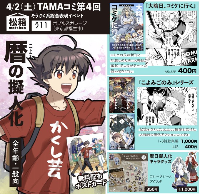 4月2日(土) #TAMAコミ(東京都福生市)おしながきです! どなたさまもお気をつけておいでください。 🗓う-11 松箱(暦日擬人化) 🗓新作は無配ポストカードです ▶︎松箱通販 matsboxxx.booth.pm ▶︎イベント概要 tamacomi.info/4/